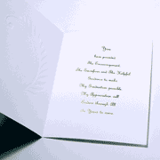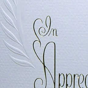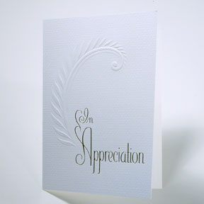 For that "really special" thank you, Announcements By You would like to suggest our In Appreciation Folder. This exquisite folder features an elegant textured heavyweight card stock with blind embossing and combination gold foil on the front. The inside text, pre printed with hot gold foil stamping, says: